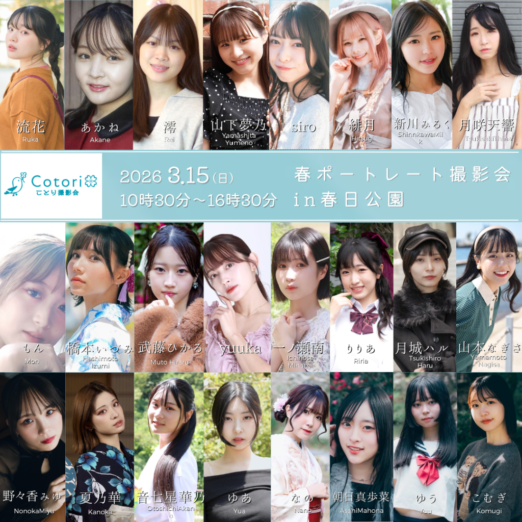 定期撮影会 SCHEDULE モデル募集 ENTRY 重要なお知らせ お知らせ一覧 2026/02/19 3月15日(日)春ポートレート撮影会in春日公園 About ことり撮影会について ことり撮影会 福岡では九州・福岡を拠点とし、 カメラについて初心者の方でもベテランの方でも 楽しめる気兼ねなく楽しめるアットホームな 撮影空間を大切にしています。 時間がたって振り返った時にも 心が温かくなるような大切な思い出を 刻んで行きたいと心より願っています。 ぜひ四季折々の撮影をお楽しみくださいませ。 撮影会のご案内 Model 所属モデル Nonoka 野上ののか プロフィール Rina リナ プロフィール Ayumi あゆみ プロフィール Yuuka yuuka プロフィール Kurumi 向葵くるみ プロフィール Kanoka 夏乃華 プロフィール Ren REN プロフィール Ichigo 今野苺 プロフィール モデル一覧 Schedule 撮影会スケジュール 2026.03.15(日) 春ポートレート撮影会in春日公園 ※予約受付中 2026.03.07(土) 古民家撮影会 at 脇山の家 ※予約受付中 2026.03.01(日) 河津桜ポートレート撮影会in白野江植物公園 ※予約受付中 撮影スケジュール お知らせ 2026/02/19 3月15日(日)春ポートレート撮影会in春日公園 \ご予約受付開始しました/ 3月15日(日)春ポートレート撮影会in春日公園 https://p ... 2026/02/15 3月7日(土)古民家撮影会 at 脇山の家 \ご予約受付開始しました/ 3月7日(土)古民家撮影会 at 脇山の家 https://phot ... 2026/02/15 3月1日(日)河津桜ポートレート撮影会in白野江植物公園 \ご予約受付開始しました/ 3月1日(日)河津桜ポートレート撮影会in白野江植物公園 https ... 2026/02/10 3月15日(日)春ポートレート撮影会in春日公園 【予告】 3月15日(日)春ポートレート撮影会in春日公園 https://photo-f.co ... 2026/02/09 3月7日(土)古民家撮影会 at 脇山の家 【予告】 3月7日(土)古民家撮影会 at 脇山の家 https://photo-f.cotor ... 公式 twitter Tweets by cotosatsu